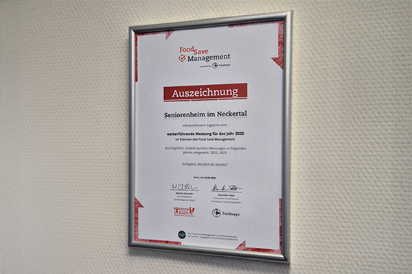 Dank präziser Planung und intensiver Kommunikation konnte das Heim nicht nur den CO₂-Ausstoss verringern, sondern auch den Wasserverbrauch erfolgreich senken. Ein besonderer Dank geht an Marianne Frischknecht, Leitung Gastronomie, und ihr Team für ihren engagierten Einsatz. Die herausragenden Ergebnisse wurden mit einer Auszeichnung im Rahmen des Food Save Managements honoriert, die das Heim für 2023 und 2025 erhalten hat. Die Urkunde ist nun stolz im Eingangsbereich sichtbar und bekräftigt das Engagement des gesamten Teams für Nachhaltigkeit und Umweltschutz mit Herz.